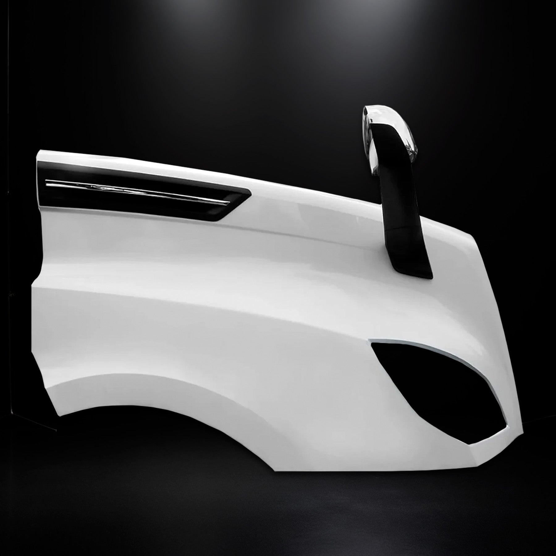 Fiberglass Hood Fender Right Passenger + Chrome Hood Mirror Pair and Side Hood Vent Black with Chrome Stripe Set