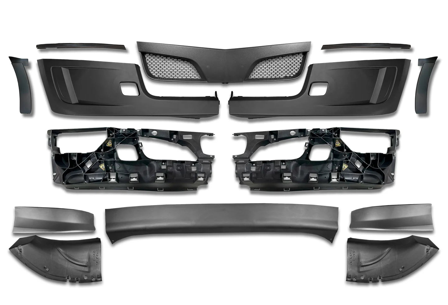 - 2x BUMPER COVERS w/o FOG LAMP HOLE, 2x Bumper Corner Inner, 1x Center Bumper Black, 2x Bumper Seal, 1x Bumper Extension, 2x Bumper Extension, 2x Bumper Cover, 2x Bumper Extension