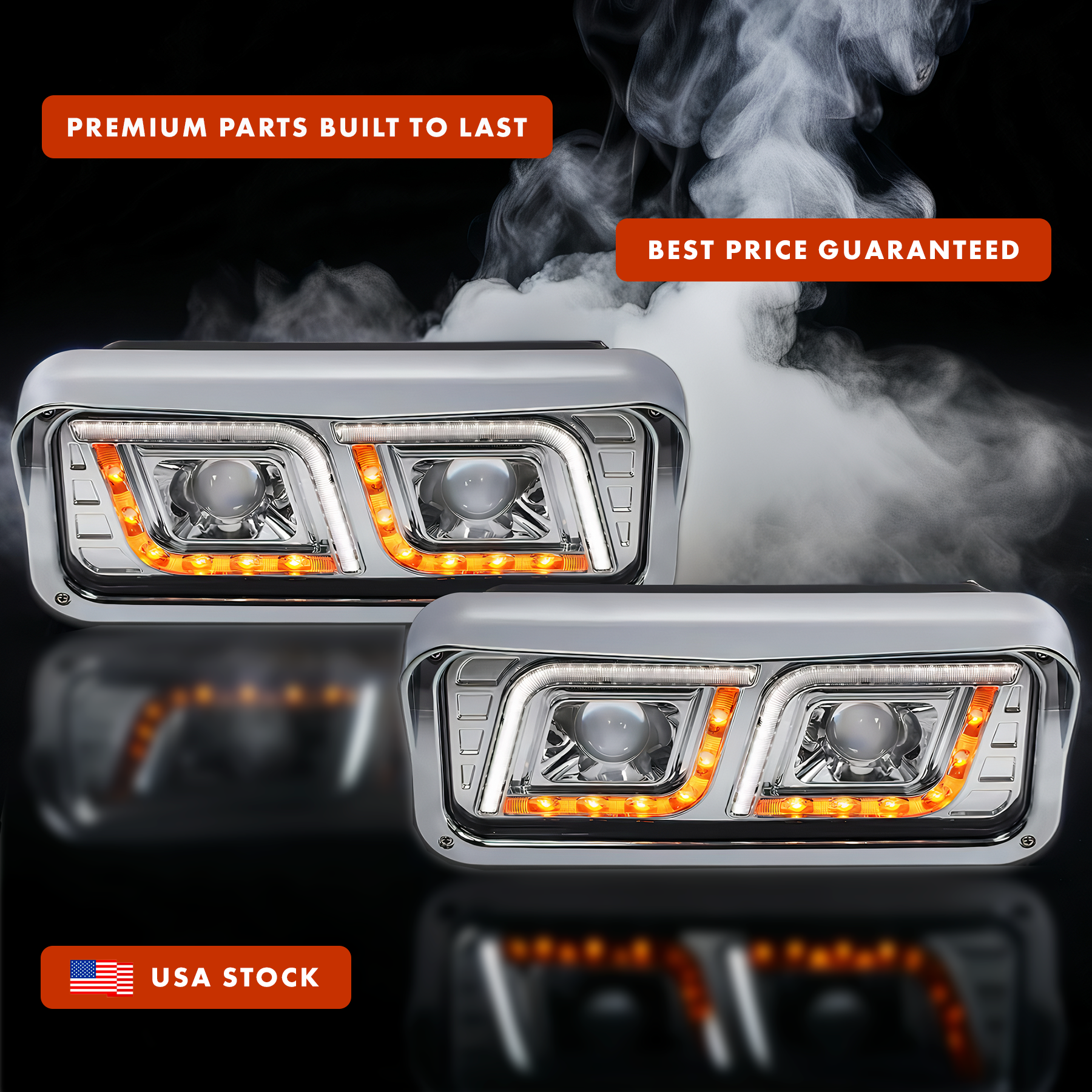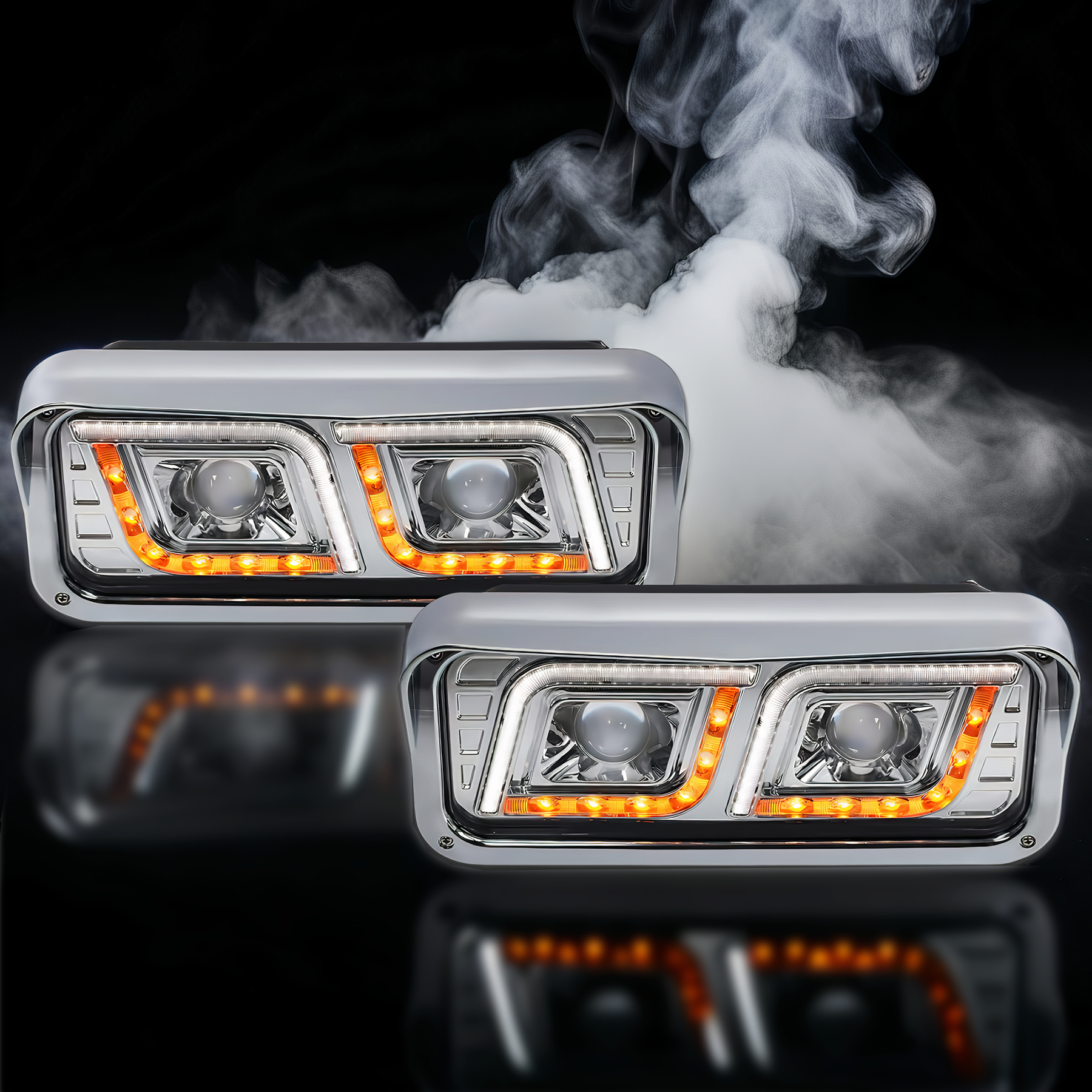 LED DRL DUAL Chrome Projector Headlights Pair (Left Driver & Right Passenger Side) for FREIGHTLINER CLASSIC